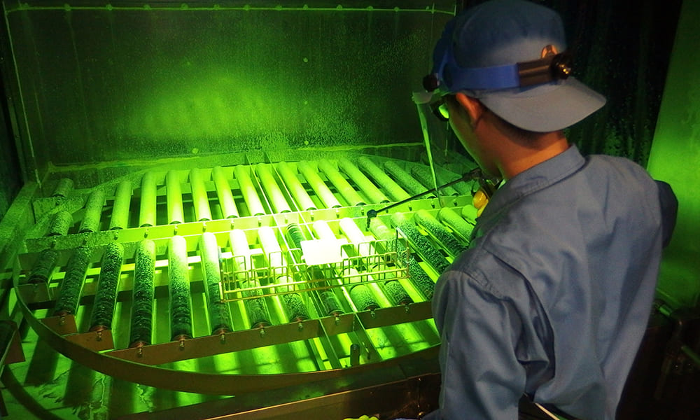 一方の手動ライン検査設備は全工程をほぼ検査員が手作業で実施します。大小様々な形状の部品に適用でき、また使用する浸透液の種類も検査対象部品に応じて変えることができるため、汎用性の高い設備となっております。